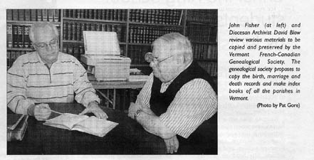In December a subcommittee of the diocesan Presbyteral Council met with members of the Vermont French-Canadian Genealogical Society at its library in the Fort Ethan Allen Complex in Colchester to discuss the aging and deteriorating condition of the diocese's old sacramental records and the need for their preservation and to discuss the accessibility of those records for historical research by the public, especially because of the lack of public documentation before 1857.